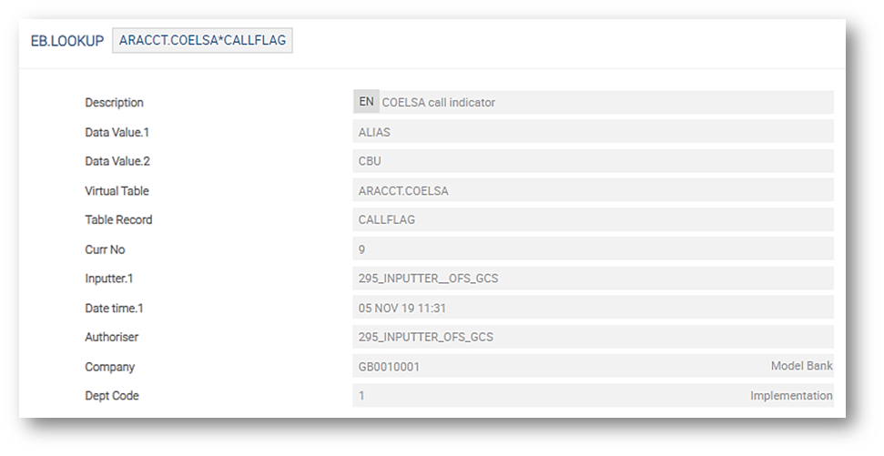 - To restrict the COELSA call, we have added a condition: only if there is a values in the Data Value fields in the EB.LOOKUP record, ARACCT.COELSA*CALLFLAG only then COELSA call will be triggered. Else no call to COELSA will happen.