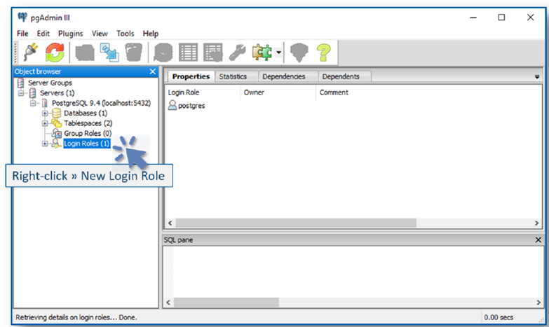 - Click OK to close the New Login Role dialog. The pgAdmin III application is displayed. We can then add a new Database and assign it to the User.