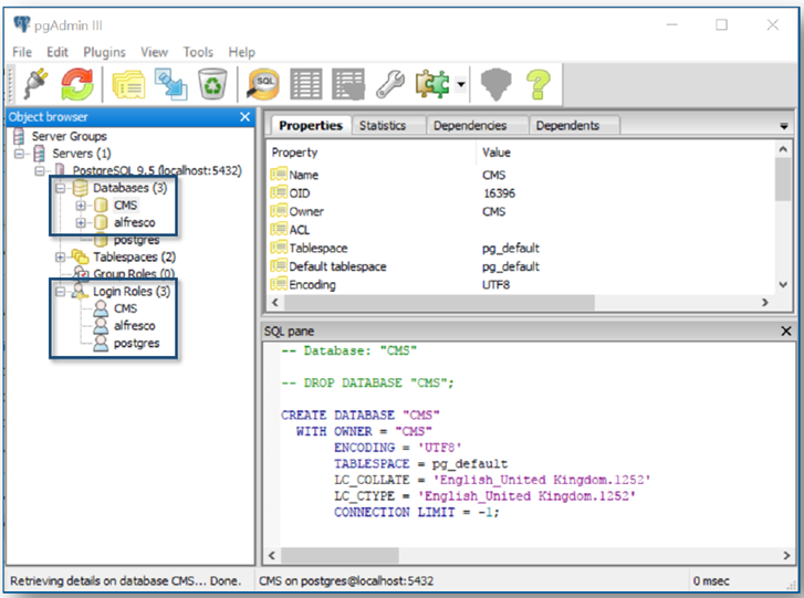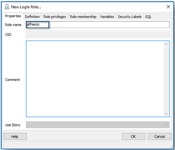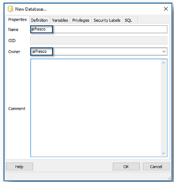 The following steps show you how to use the PostgreSQL pgAdmin III application to add a Database and User for use with Alfresco.