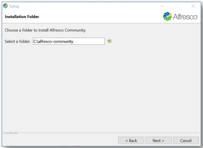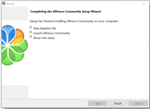 - Welcome: Displays “Welcome to the Alfresco Community Setup Wizard”.