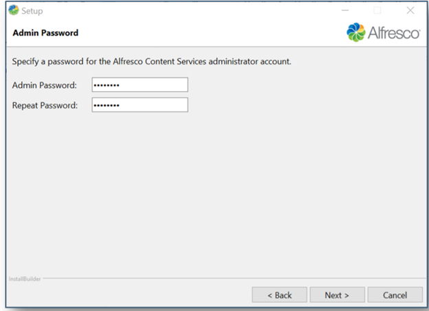 - Admin Password: Specify a password for the Alfresco administrator account..