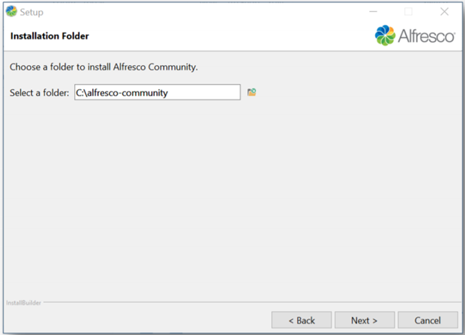 The Installation folder screen allows you to select the Alfresco target installation folder.