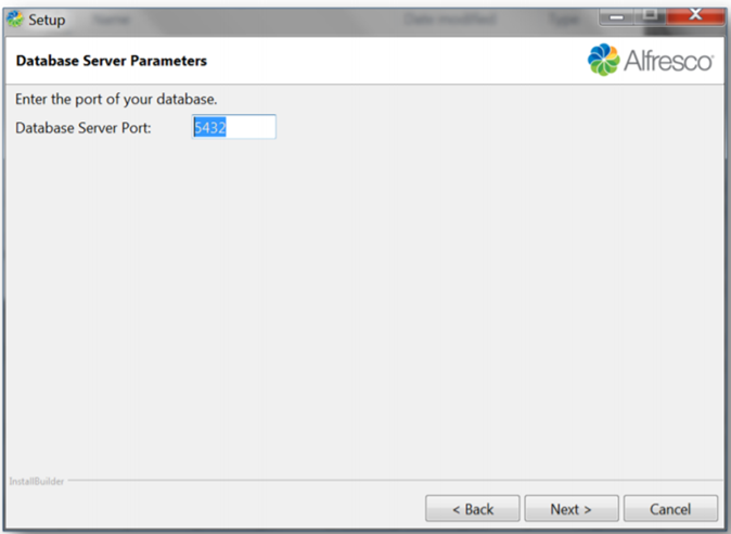 The Database Server Parameters screen allows you to enter the port number of the database that Alfresco will use.