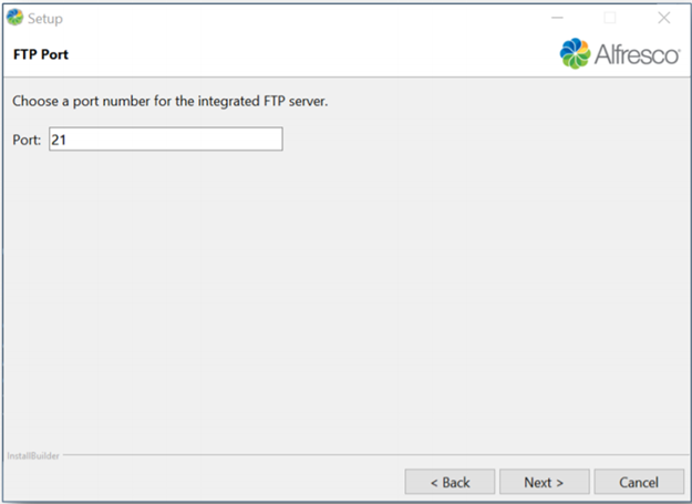 - Alfresco FTP Port: Choose a port number for the integrated Alfresco FTP server.
