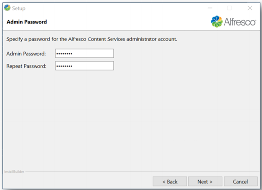 - Admin Password: Enter a password for the Alfresco administration account.