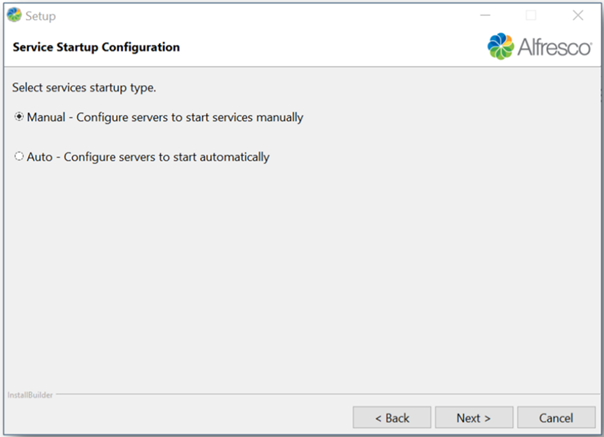 The Service Startup Configuration screen allows you to select if you want services used by Alfresco such as Tomcat Server to start automatically or if you want to start these manually.