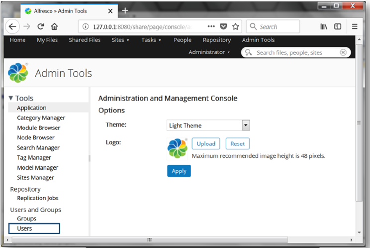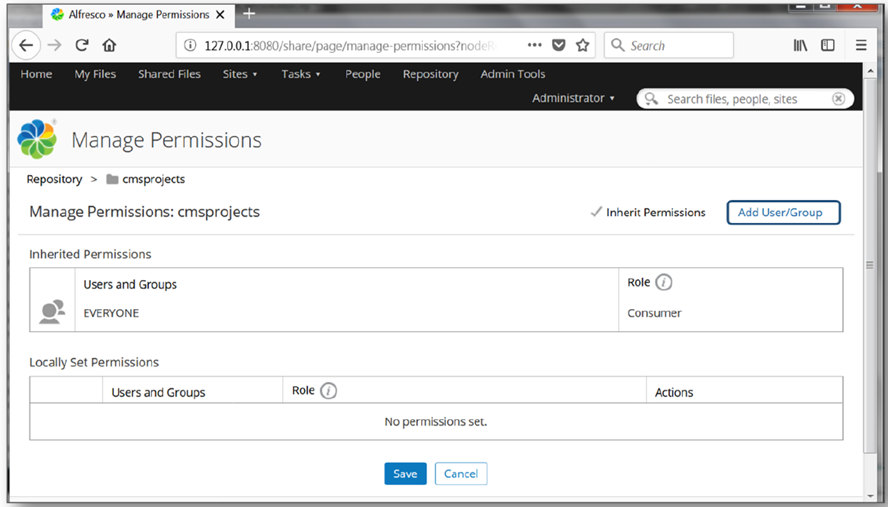 The following pages show how to set permissions for the ‘admin’ user on the folder /cmisprojects and to add a new user called ‘coordinator’. You will then be able to login to Live CMS with these user names and create and publish Live CMS articles.
