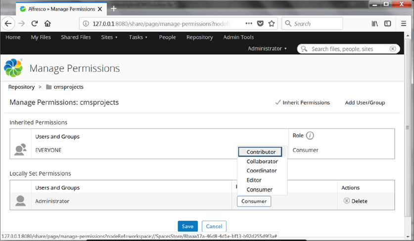 - Click on the default Consumer role and select Contributor from the list. This will ensure that the admin user in Live CMS has all the required actions to create content for Live CMS will be supported in Alfresco.