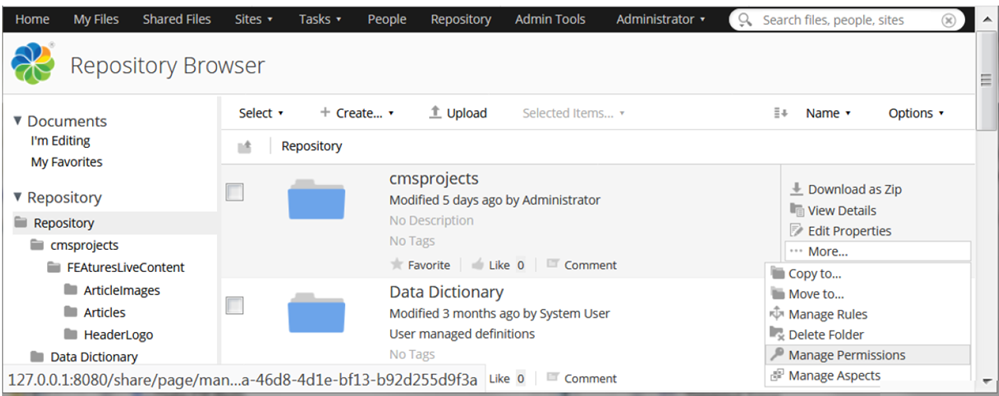 - Select Create User and after confirmation that the coordinator user has been created, select the Repository tab. With the folder cmsprojects highlighted, click More then select Manage Permissions.