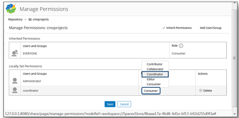 - Select the default Consumer role and choose Coordinator from the drop down list, then select Save to finish.