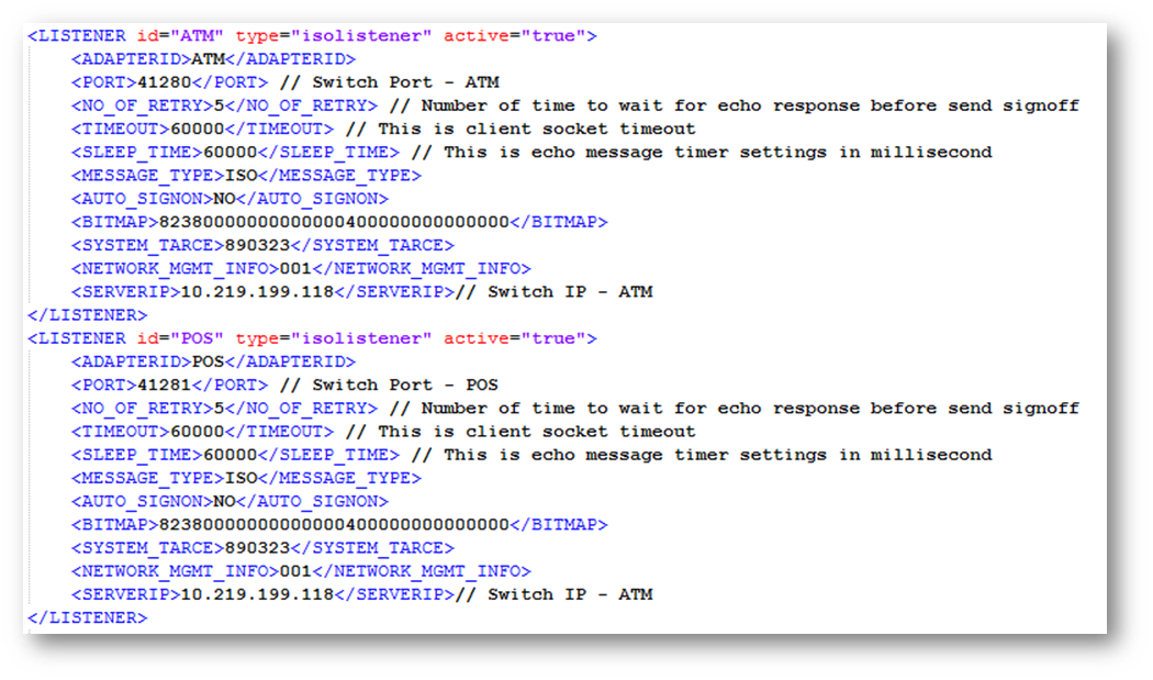 - Create the Listeners for ATM and POS inside the LISTENERS tag as shown below.