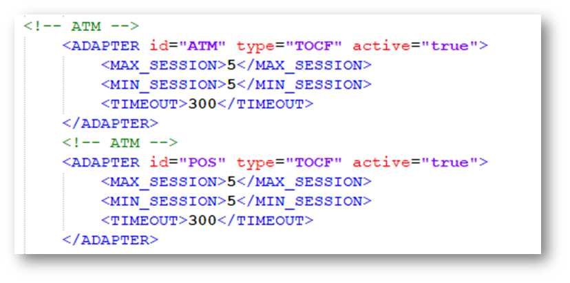 - Create the Adapters for ATM and POS inside the ADAPTERS tag as shown below.