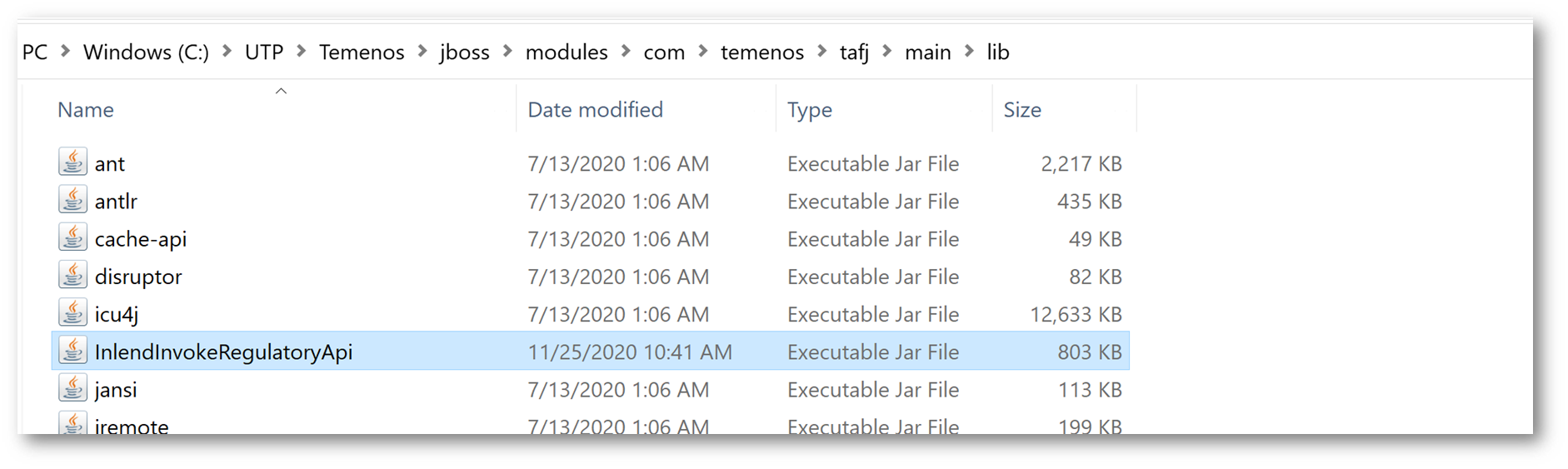 - The InlendInvokeRegulatoryApi.jar file for the external API call needs to be placed in the \jboss\modules\com\temenos\tafj\main\lib location, and also make an entry in the module.xml in the \jboss\modules\com\temenos\tafj\main location.