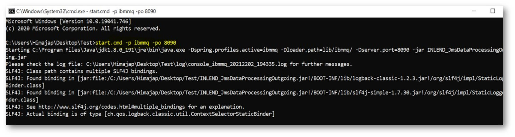 - Open the command prompt from the above location and run the Start.cmd –p ibmmq –po {DesiredPortNo} command.