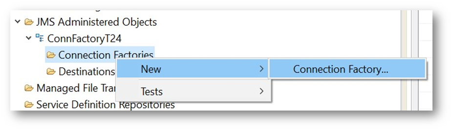 - Under the created connection factory nickname, right click on Connection Factories>New>Connection Factory.