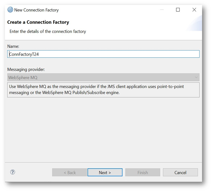 - Give the connection factory name. Can be the same or different from the nickname. Click on the Next button.