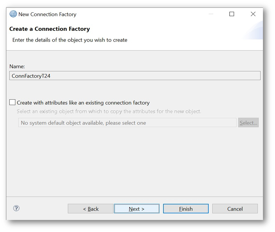 - Give a nickname for the connection factory and click on the Finish button.