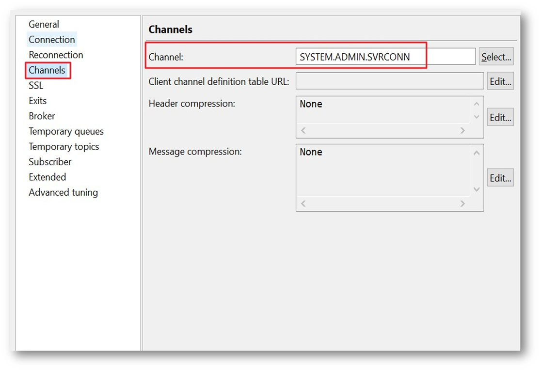 - For the IBM MQ Channel name, in the Channels tab, give the Channel name, as per below.