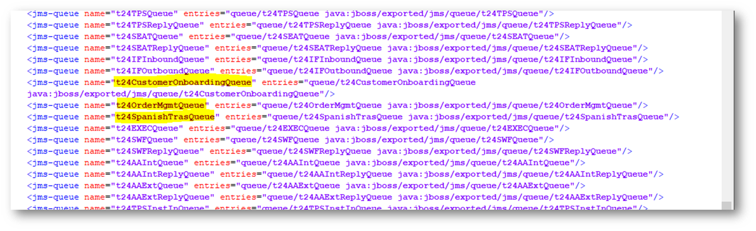 <jms-queue name="t24SpanishTrasQueue" entries="queue/t24SpanishTrasQueue java:jboss/exported/jms/queue/t24SpanishTrasQueue"/>