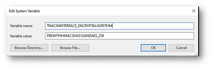 - TNACININTERFACE_ENCRYPTALGORITHM=<Algorithm name>.