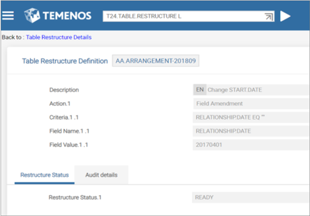 Example of updated T24.TABLE.RESTRUCTURE and Table Restructure Definitions.