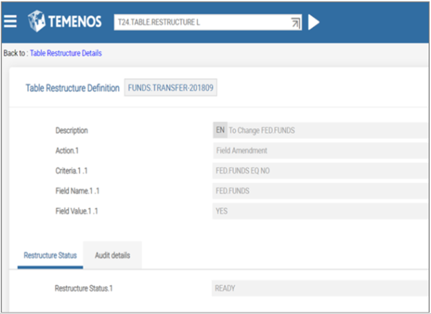 - It releases restructure definitions records from Temenos Transact release package into T24.TABLE.RESTRUCTURE as a pre-release of data items for restructure service process.