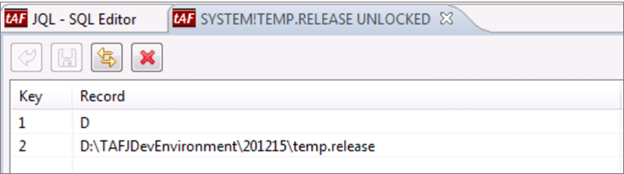 - Create a temp.release record inside the SYSTEM file using the JQL-SQL editor as shown below.