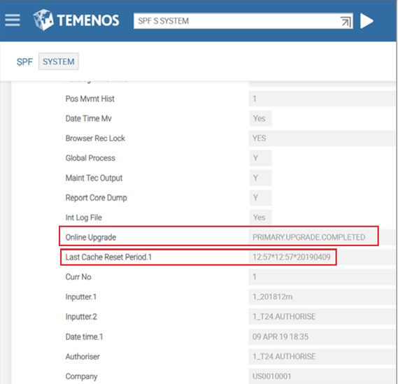 - You can see the updated SPF SYSTEM record with the Current Release field value as 201812 and Online Upgrade field value as PRIMARY.UPGRADE.COMPLETED. The cache reset period value is updated and moved to the Last Cache Reset Period field by T24.AUTHORISE service because once the Temenos Transact system becomes online, the re-connected sessions can reset cache only once per session and need not repeat cache reset every day.